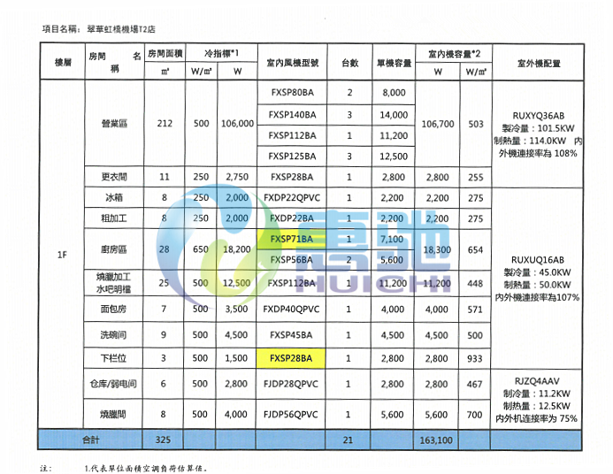 虹橋機場店空調(diào)系統(tǒng)技術(shù)配置表