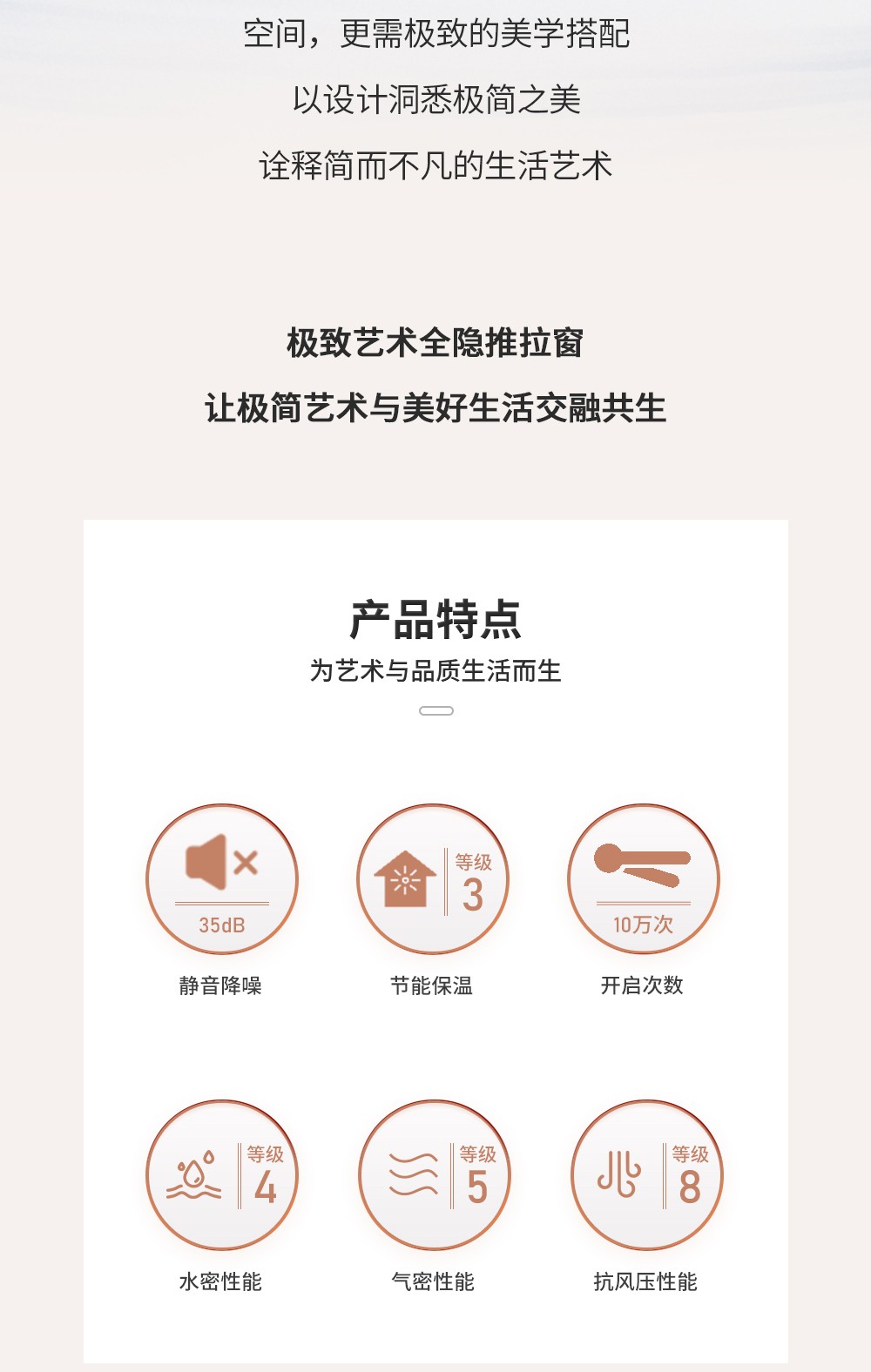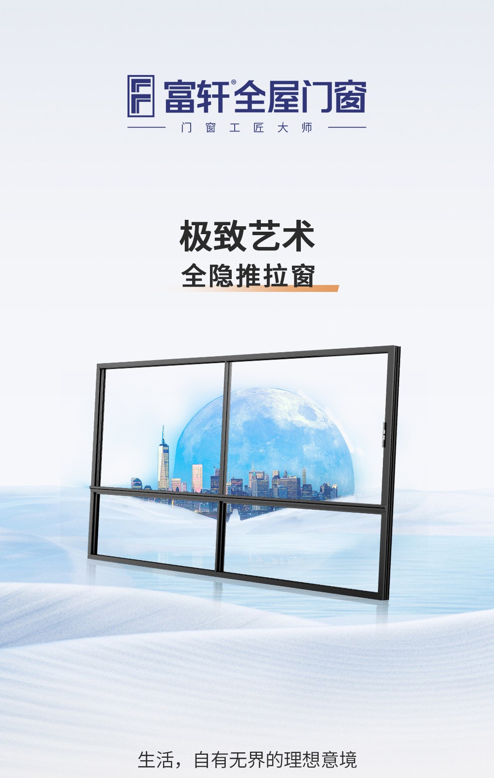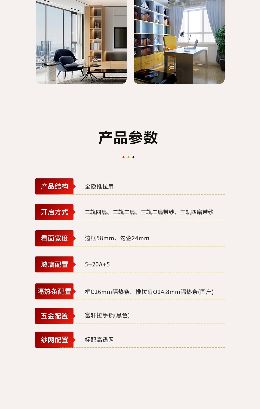 【產品系列】:推拉窗 【產品性能】:水密性能4級、隔音性能≥35DB、氣密性能5級、抗風壓性能8級、保溫性能K≤2.2 【產品結構】:獨特全隱框扇、多腔體排水結構、采用自主研發推拉鎖、超高74mm扶手,5+20A+5中空玻璃 【開啟方式】:二軌四扇、二軌二扇、三軌二扇帶紗、三軌四扇帶紗 【五金配件】:標配不銹鋼高清網