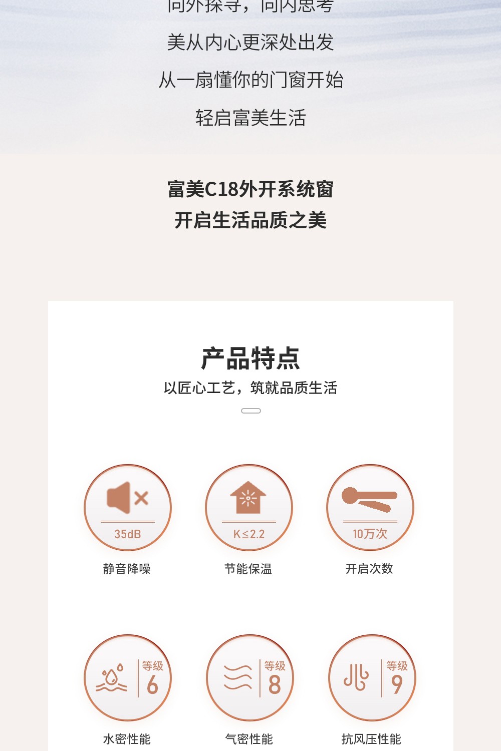 系列:富美C18 型號:C18/原F8 水密性能:6級 氣密性能:8級 抗風壓性能:9級 隔音性能:≥35DB 保溫性能:K≤2.2 隔熱條:國產隔熱條 膠條工藝:拼接工藝 壁厚:1.8mm 中空:5+15A+5 壓線:圓弧壓線 開啟方式:外開、外開外懸、下懸窗 防護欄/選配:固定 護角:圓弧護角(不銹鋼) 紗網:選配 標配鎖具:維哈根無底座歪執手