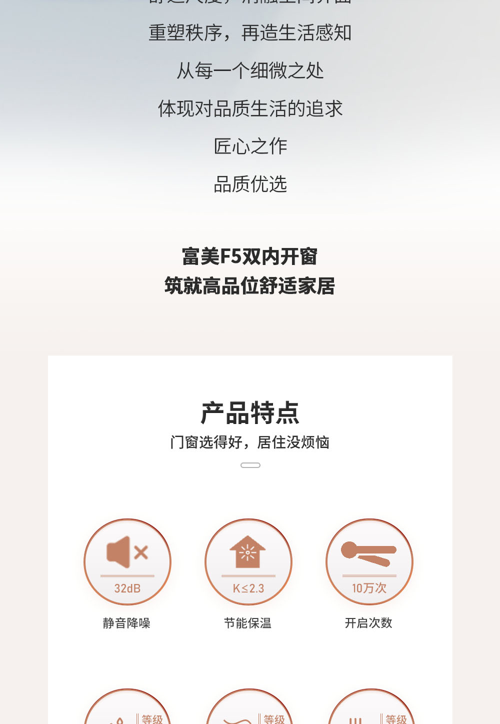 系列:富美 型號:F5 水密性能:6級 氣密性能:8級 抗風壓性能:9級 隔音性能:≥32DB 保溫性能:K≤2.3 隔熱條:國產隔熱條 膠條工藝:標配:拼接工藝,可選配焊接工藝 壁厚:2.0mm 中空:5+15A+5 壓線:方形壓線 開啟方式:內開、內開內倒 防護欄/選配:玻璃護欄 護角:圓弧護角(不銹鋼) 紗網:選配 標配鎖具:維哈根無底座高執手