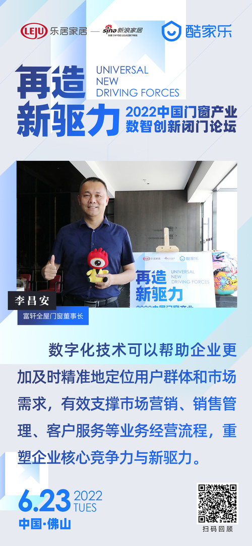 新浪門窗頻道訊 6月23日下午,新浪家居聯(lián)合酷家樂特別舉辦“再造新驅(qū)力——2022 中國門窗產(chǎn)業(yè)數(shù)智創(chuàng)新閉門論壇”。論壇上,富軒全屋門窗董事長李昌安指出,數(shù)字化技術可以幫助企業(yè)更加及時精準地定位用戶群體和市場需求,有效支撐市場營銷、銷售管理、客戶服務等業(yè)務經(jīng)營流程 ,重塑企業(yè)核心競爭力與新驅(qū)力。