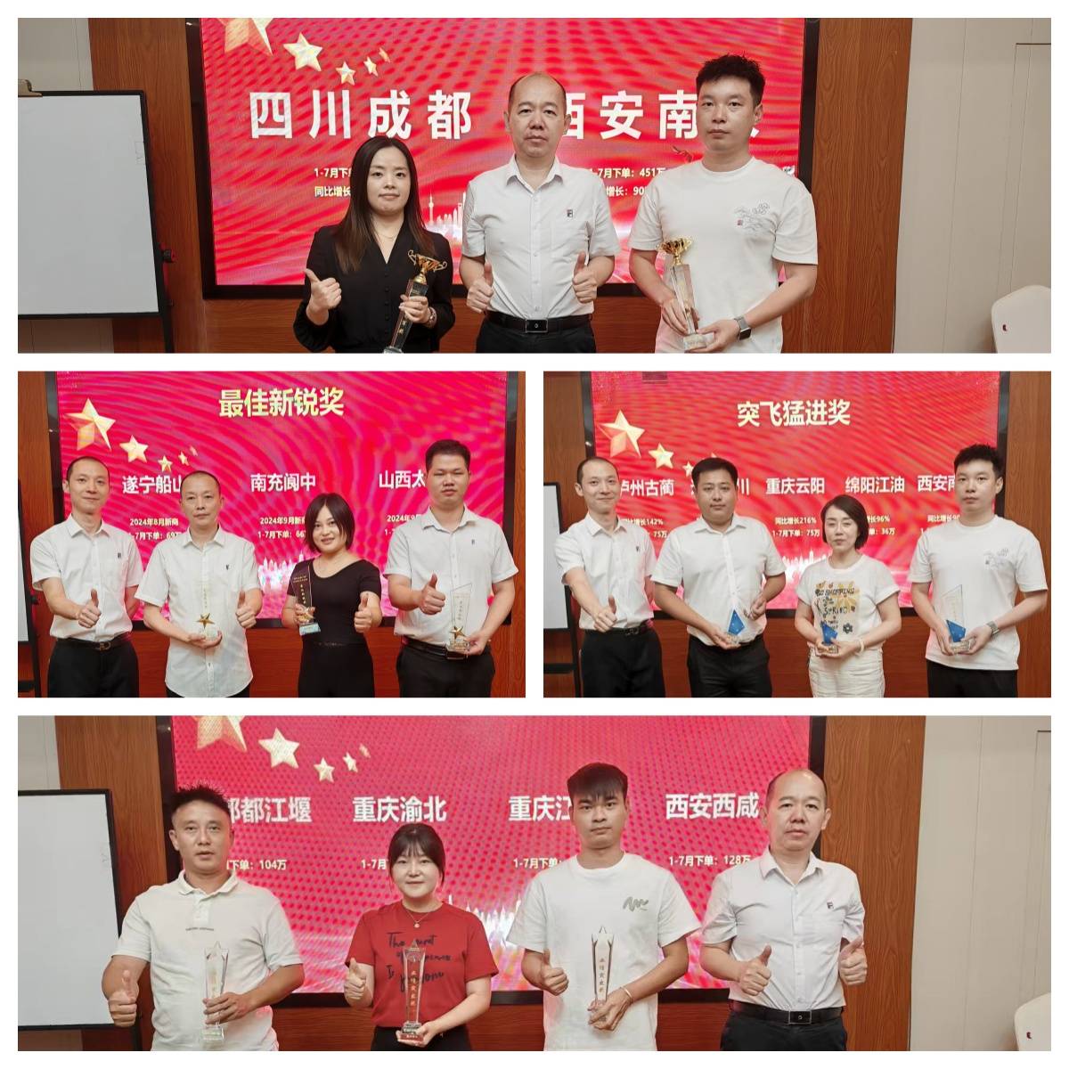 在2025上半年,川渝戰(zhàn)區(qū)和陜甘青寧晉戰(zhàn)區(qū)在總部的總體布局、營銷政策、以及各經(jīng)銷商伙伴的不懈努力下,各區(qū)域都有不少優(yōu)秀門店業(yè)績得到突破性增長,同時也有不少新商突破新店初期業(yè)績增長難的大關(guān),取得了十分耀眼的成績,因此,為感謝各區(qū)域經(jīng)銷商伙伴在上半年對富軒集團(tuán)總部的支持與付出,總部特別設(shè)立最佳新銳獎、突飛猛進(jìn)獎、業(yè)績突出獎、銷售冠軍獎等多個獎項(xiàng),激勵更多終端門店以此為標(biāo)桿,突破自我,通過此次目標(biāo)制定與總體發(fā)展規(guī)劃,各區(qū)域門店取得更為優(yōu)異的成績!