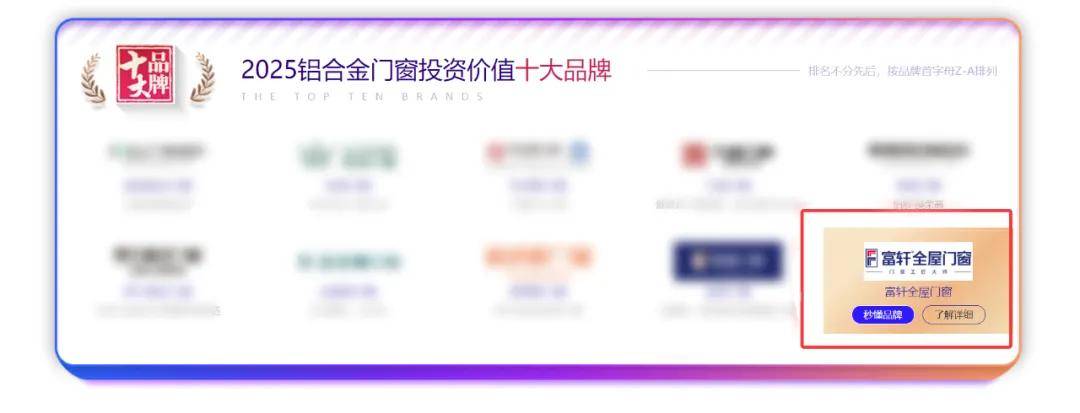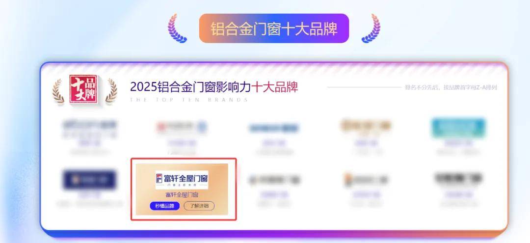 9月1日,居美 | 中華建材網(wǎng)主辦的“2025家居建材行業(yè)品牌力綜合指數(shù)大數(shù)據(jù)榜”中,富軒全屋門窗以雄厚的品牌實(shí)力、卓越的產(chǎn)品力以及優(yōu)質(zhì)的服務(wù)力再度強(qiáng)勢(shì)斬獲“鋁合金門窗影響力十大品牌”,同時(shí)在此次評(píng)選中斬獲新榮譽(yù)“鋁合金門窗投資價(jià)值十大品牌”,兩項(xiàng)重磅榮譽(yù),再次用榮譽(yù)證明了富軒全屋門窗的實(shí)力!