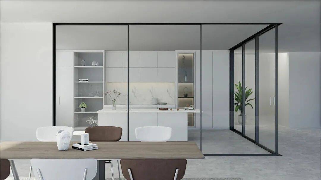富軒全屋門窗富隱MT16百變推拉門輕松將廚房與客廳隔斷,左右推拉啟閉,不占用過多空間,烹飪時輕輕一關,廚房與客廳、餐廳瞬間分區,互不干擾。